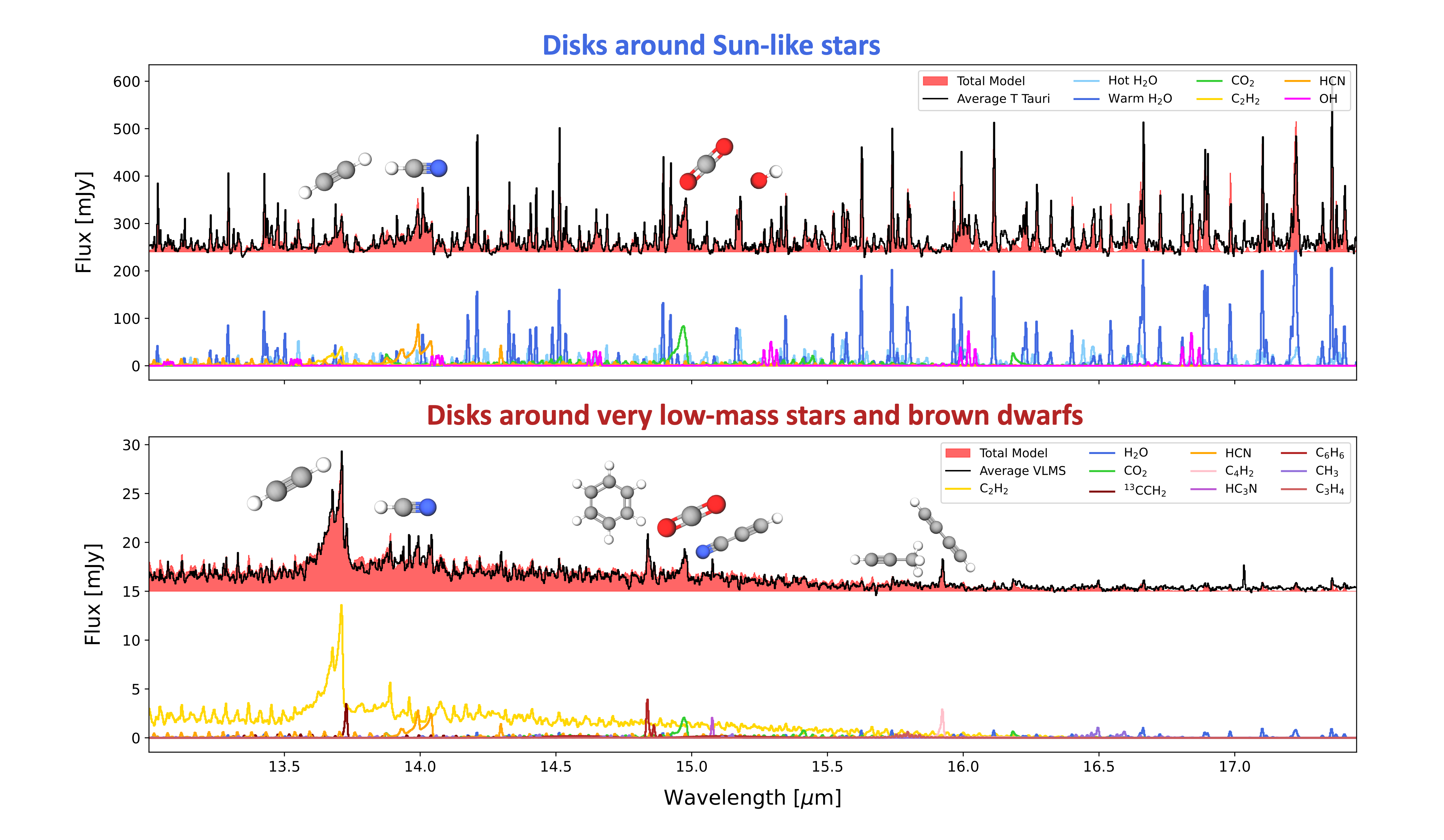 From water-rich disks around Sun-like stars to carbon-rich disks around very low-mass stars and brown dwarfs
